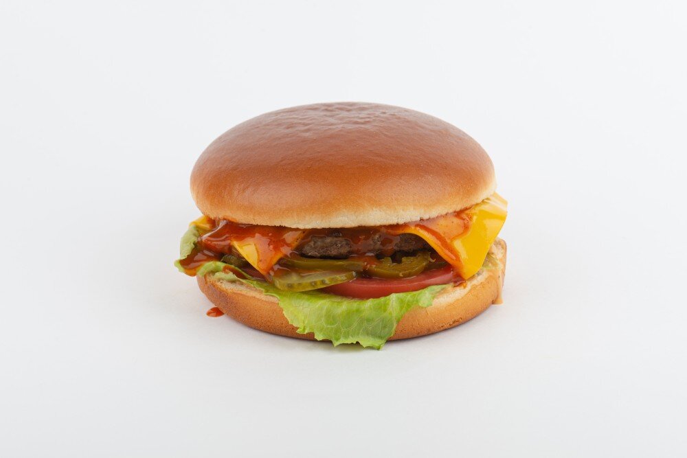 булочка бриошь/лист салата/котлета из мраморной говядины/свежий помидор/огурец маринованный/сыр чеддер/халапеньо маринованный/соус 1000 островов/соус шрирача